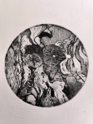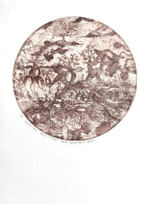 Architecte, enseignante universitaire et artiste, Amel Ghammem développe depuis plus de vingt-cinq ans une pratique où le dessin et la gravure prolongent naturellement son activité d’architecte et d’enseignante. Son travail construit un univers singulier, nourri par l’exploration des formes enfouies, des couches célestes et des créatures imaginaires qui les traversent. À la croisée de l’histoire, de l’archéologie et de l’architecture, ses dessins et gravures interrogent la mémoire et le temps. Chaque œuvre se déploie comme un territoire à parcourir : des récits multiples émergent progressivement, portés par une richesse de détails et de figures, invitant le regard à une exploration sensible de son univers.
